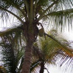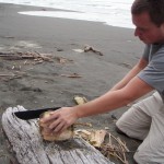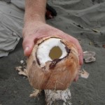 At one of the beaches we stopped for a little rest and exploration. I tried to knock down a coconut from a palm tree with a smaller coconut I found on the ground (as i had done the previous night in puerto viejo but with rocks). That endeavor being flighty, lauren and I worked together to concoct a way to wrangle one of the elusive coconuts from a palm tree. We found a washed up piece of driftwood, a forgotten bit of plastic tie, another fallen branch, and a machete and collaborated our materials and brains until we finally pulled down a whomping mo fo of a coconut, or so we thought. I went to work on that thing with my machete on the beach. Lauren took some pictures as I mangled the nut. I was able to hack it open and lauren and I sat staring at the open ocean and sipping on fresh coconut milk then we ate the innards of the coconut. The water and rind were both delicious and even more so because we murdered that shiz together on the beach.