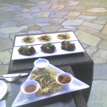 Since we were at the pool, Chris had forgotten to bring down his wallet. Of course we were ided, so we had to go all the way back upstairs to prove he is 24. We though the drinks were going to be really expensive because the place looked really fancy and all the waiters were wearing tuxes but you could get anything on draft in a big glass for $5.00. We order our beers and go to sit outside. A cocktail waitress asks if we wanted any appetizers and we decided to order a few for our dinner. We got teriyaki wings, lobster tacos, and calamari. The food was all really delicious and plated really well. We had a couple more drinks and then decided to hit the hot tub.