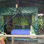The walk was easy as we were hella motivated by the remembered images of the ocean front oasis that we’d seen the previous day on walkabout. As we approached paradise our steps quickened, the acceleration having something to do with the overloaded and mucho heavy packs we had straddling our backs and the central -American sunbeams beating down overhead. By this point Lauren was as good as broke so I foot the bill for a night of relaxation and restoration in one of the resorts bungalows which were “tent like” outdoor dwellings each with two twin beds or one king-size bed, running water, electricity, a fan, a mini-fridge, a porch, and a lighted pathway. There were well-kept community bathrooms for the bungalows which were as close to an outhouse as I’d ever prefer to get. After paying for the room we were told by the most gracious clerk that our tent had to be given a good once over by the housekeepers and that we could wait at the pool or in the hotel restaurant if we so chose. I was burning up and Lauren was rapidly melting into a pool of sweat on the ground so we dashed on over to the cool crystal waters hidden