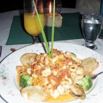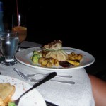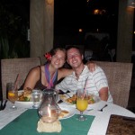with some kind of sea grass so it looked like a little pouch. I had a seafood linguine of shrimp, scallops, and other various sea creatures served in a buttery sauce. We took down the wine and some of our food but were enjoying the atmosphere too much to worry about our hunger pangs. So, we asked the waiter if we could have our meals packed up as leftovers then took the food back to our bungalow and stored it there in the mini fridge.